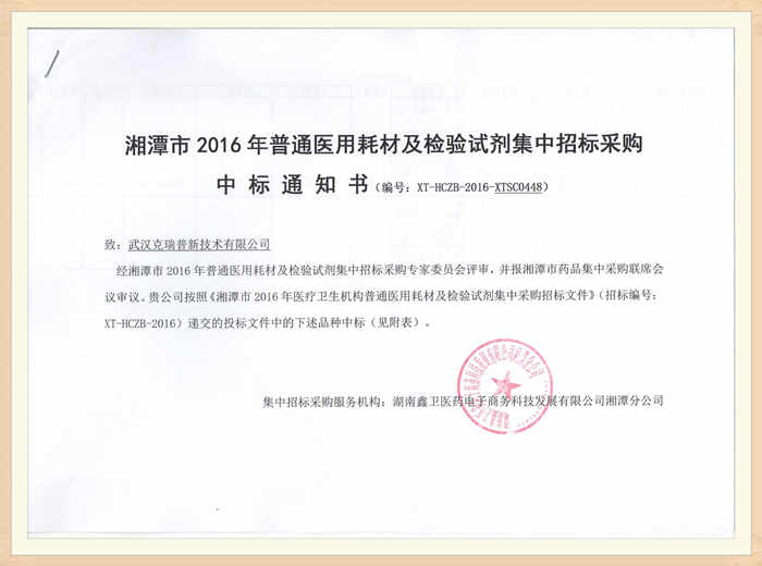 【湖南省湘潭市2016年普通醫(yī)用耗材及檢驗(yàn)劑集中招標(biāo)采購中標(biāo)通知書】經(jīng)湘潭市2016年醫(yī)用耗材招標(biāo)采購中經(jīng)專家評審,并報(bào)湘潭市藥品集中采購聯(lián)席會審議我們武漢克瑞普新技術(shù)有限公司已經(jīng)成功中標(biāo),中標(biāo)的產(chǎn)品是胸腔固定夾板(A1型)已在多家醫(yī)院臨床使用使用反應(yīng)良好。
