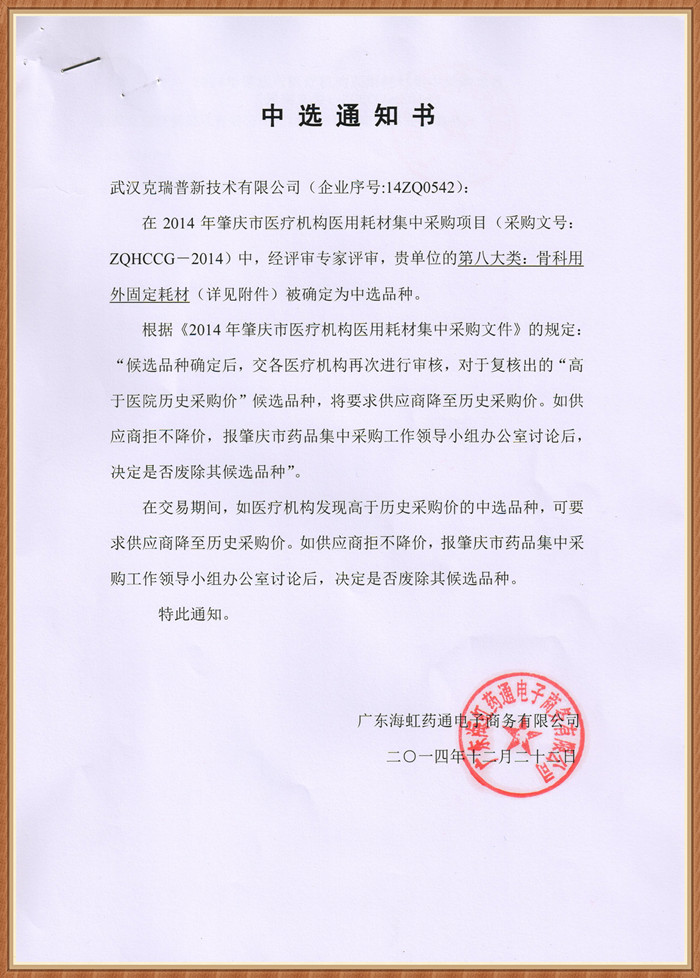 【廣東省2014年肇慶市醫(yī)療機構(gòu)醫(yī)用耗材集中采購項目中標通知書】武漢克瑞普新技術(shù)有限公司(采購文號:ZQHCCG-2014)中我們公司生產(chǎn)的骨科用外固定耗材產(chǎn)品已成功中標,我們的骨科耗材產(chǎn)品種類較多,全部為一類的骨科耗材產(chǎn)品歡迎各大經(jīng)銷商與我們?nèi)〉寐?lián)系。