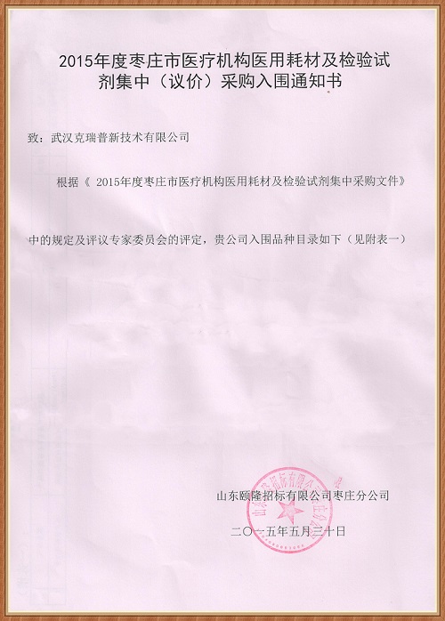 【山東省2015年度棗莊市醫(yī)療機構醫(yī)用耗材及檢驗試劑集中(議價)采購入圍通知書】武漢克瑞普出品的胸腔固定夾板經(jīng)過委員會專家評定,我公司的產(chǎn)品成功中標入圍,本次中標產(chǎn)品數(shù)量較少我們的胸骨固定板是由高分子納米材料、記憶鋁合金板、多頭胸背部肋骨固定帶等組成,使用方便患者使用過程中不會感到有束縛感同時還可以緩解患者的呼吸。
